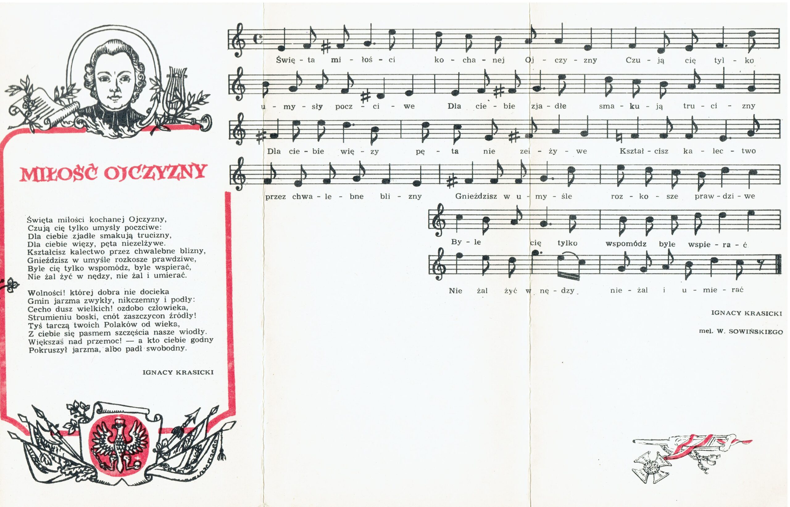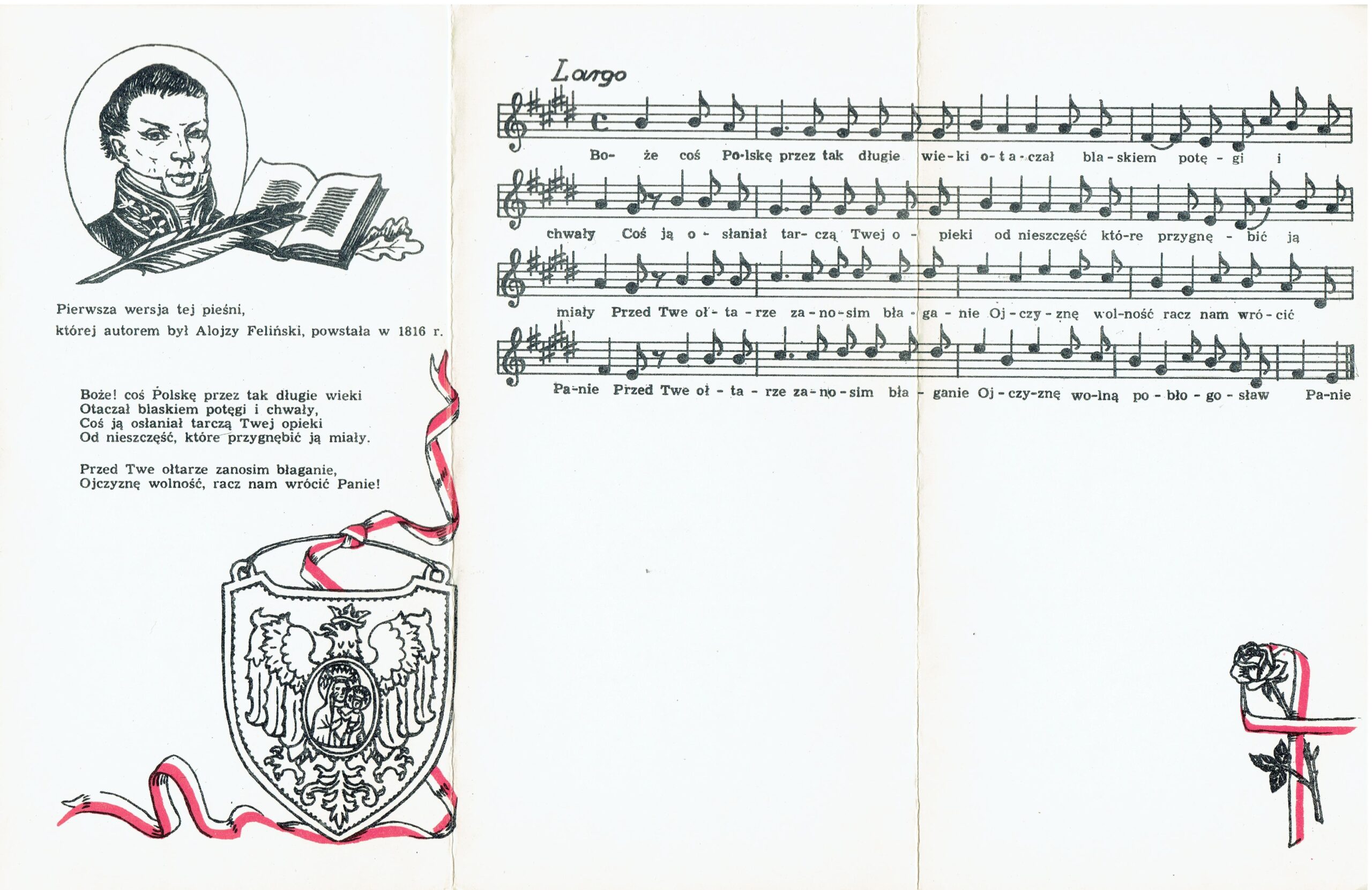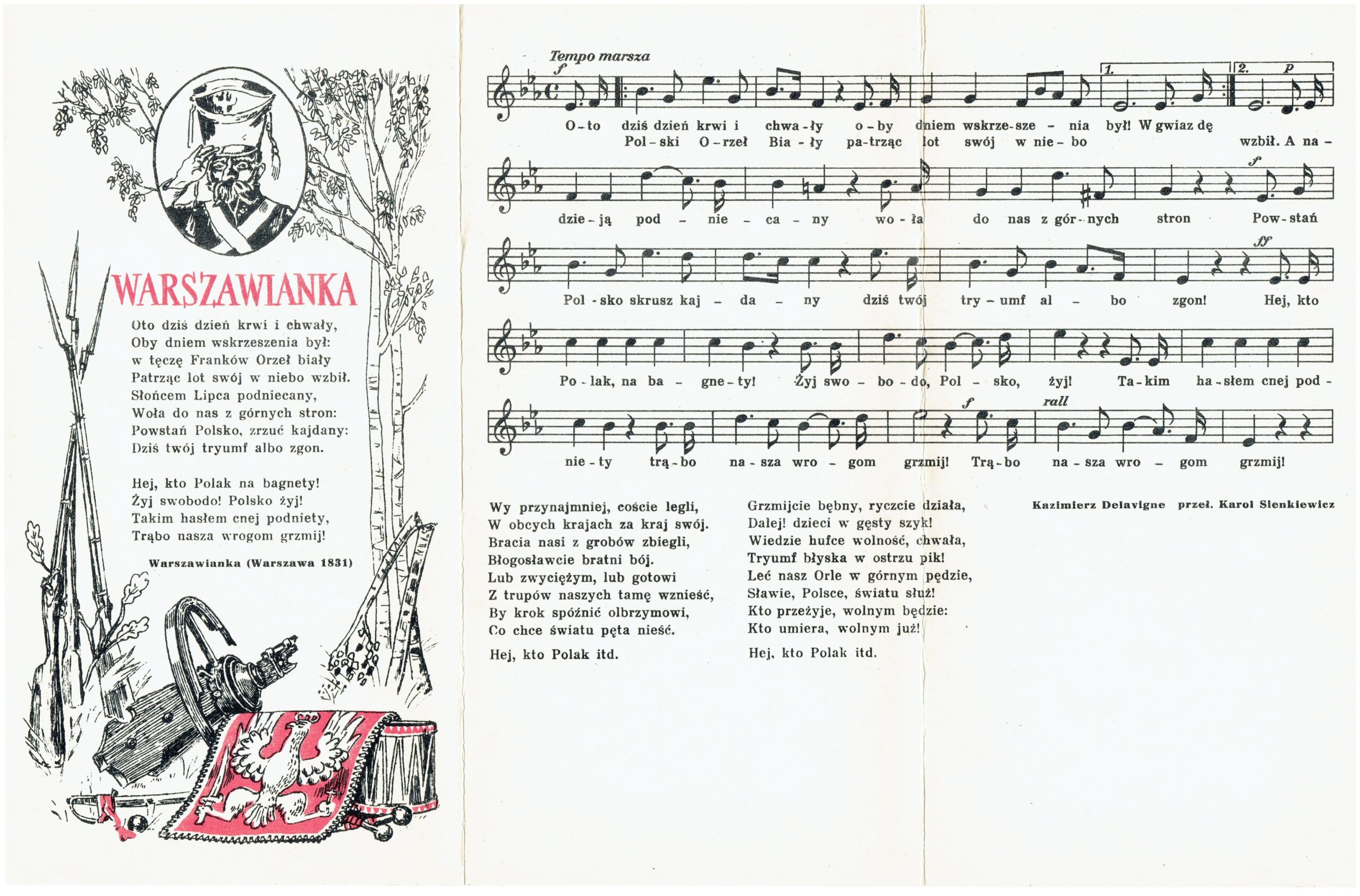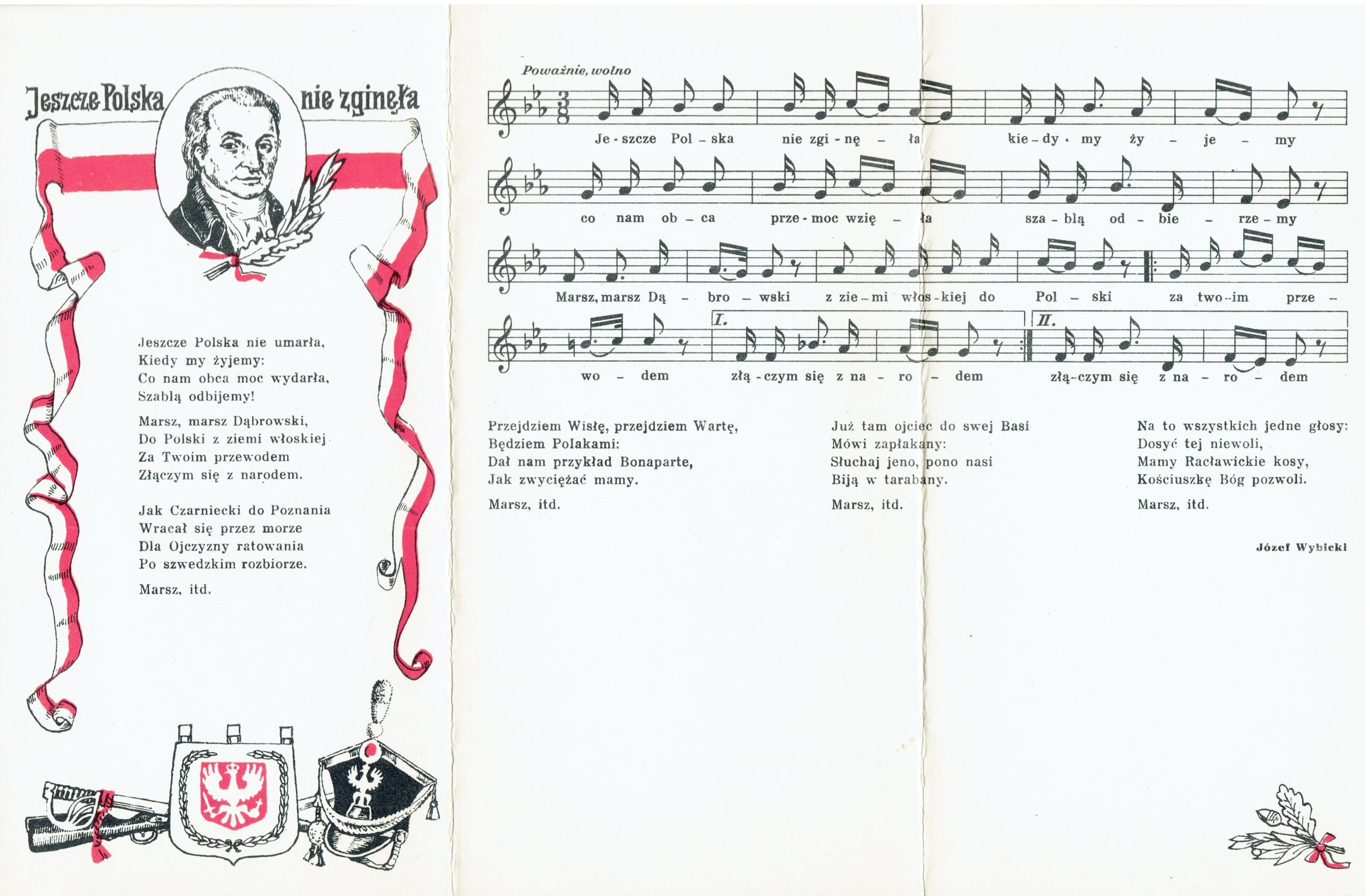 ,,Bogurodzica”, ,,Jeszcze Polska nie zginęła”, ,,Warszawianka”, ,,Boże coś Polskę”, ,,Miłość Ojczyzny”, oraz ,,Rota”.